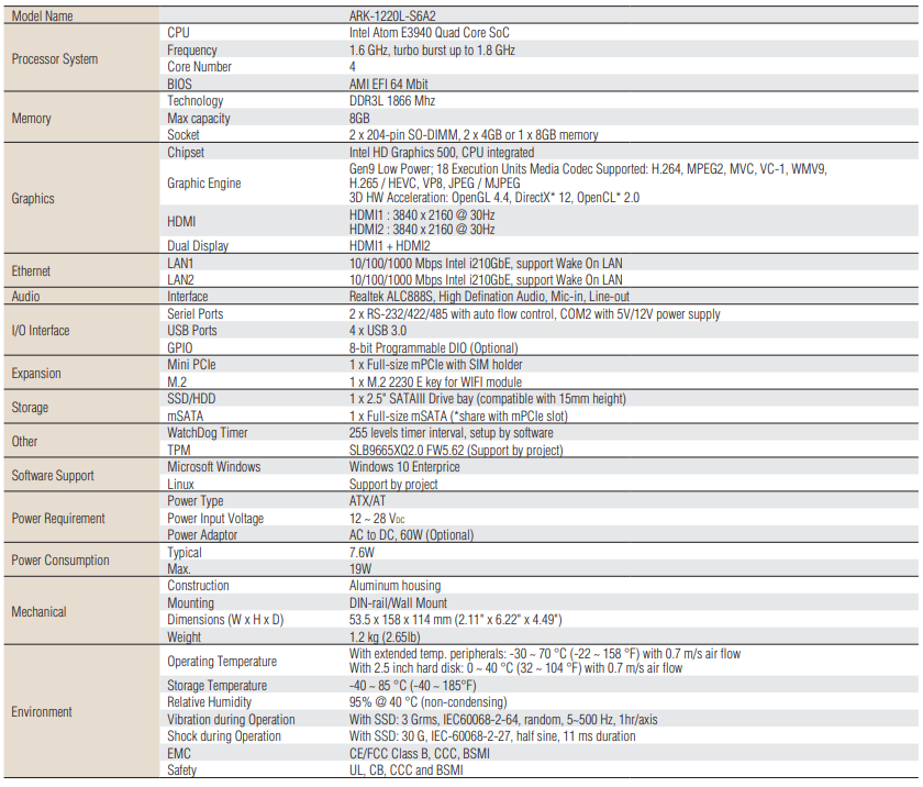 英特尔凌动E3940 QC SoC,4K分辨率,双HDMI /双LAN / M.2 DIN导轨安装无风扇嵌入式工控机